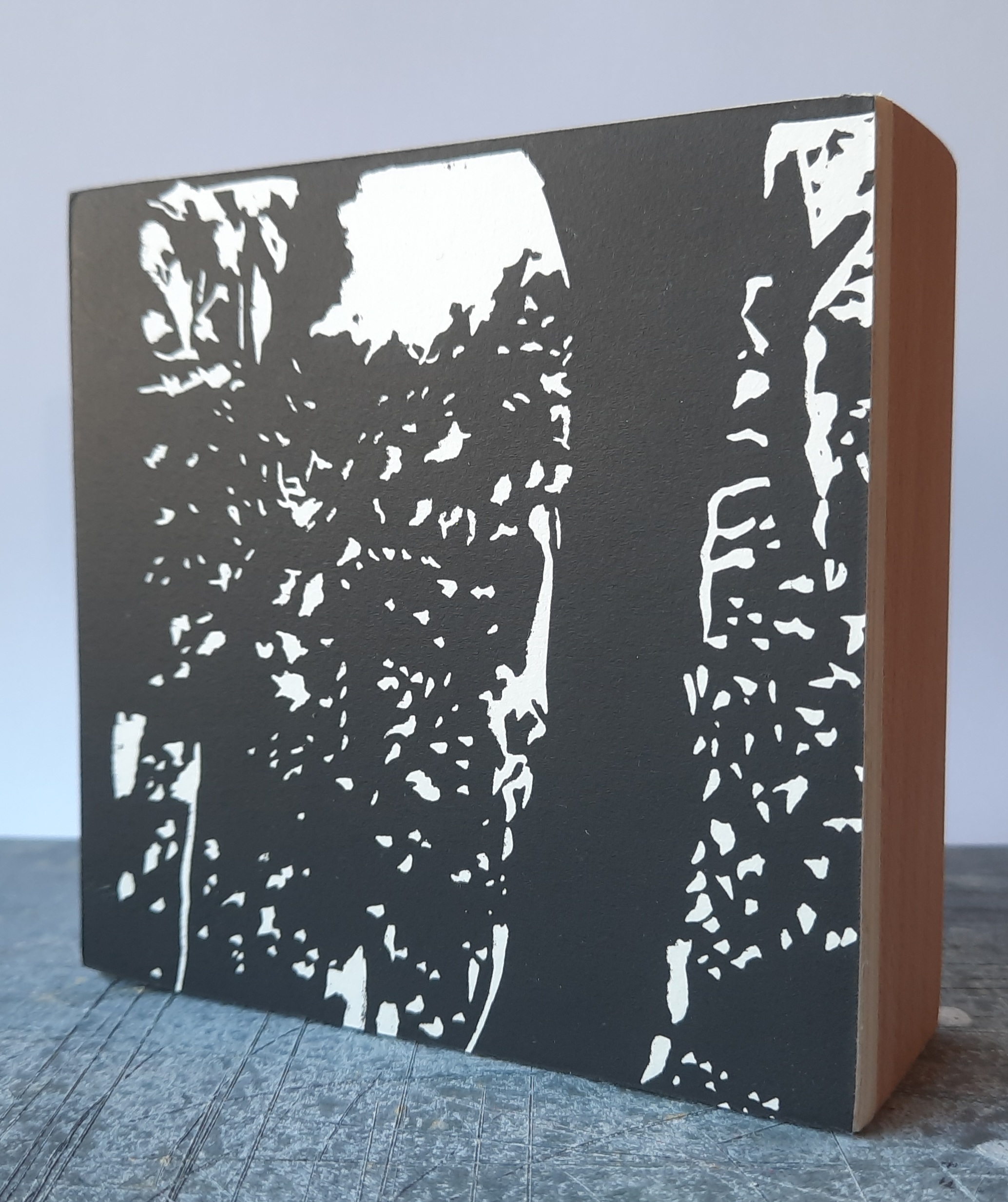 Linoleumdruk op papier gelijmd op een mooi houten blok 10x10x3 cm. Met ophangsysteem.