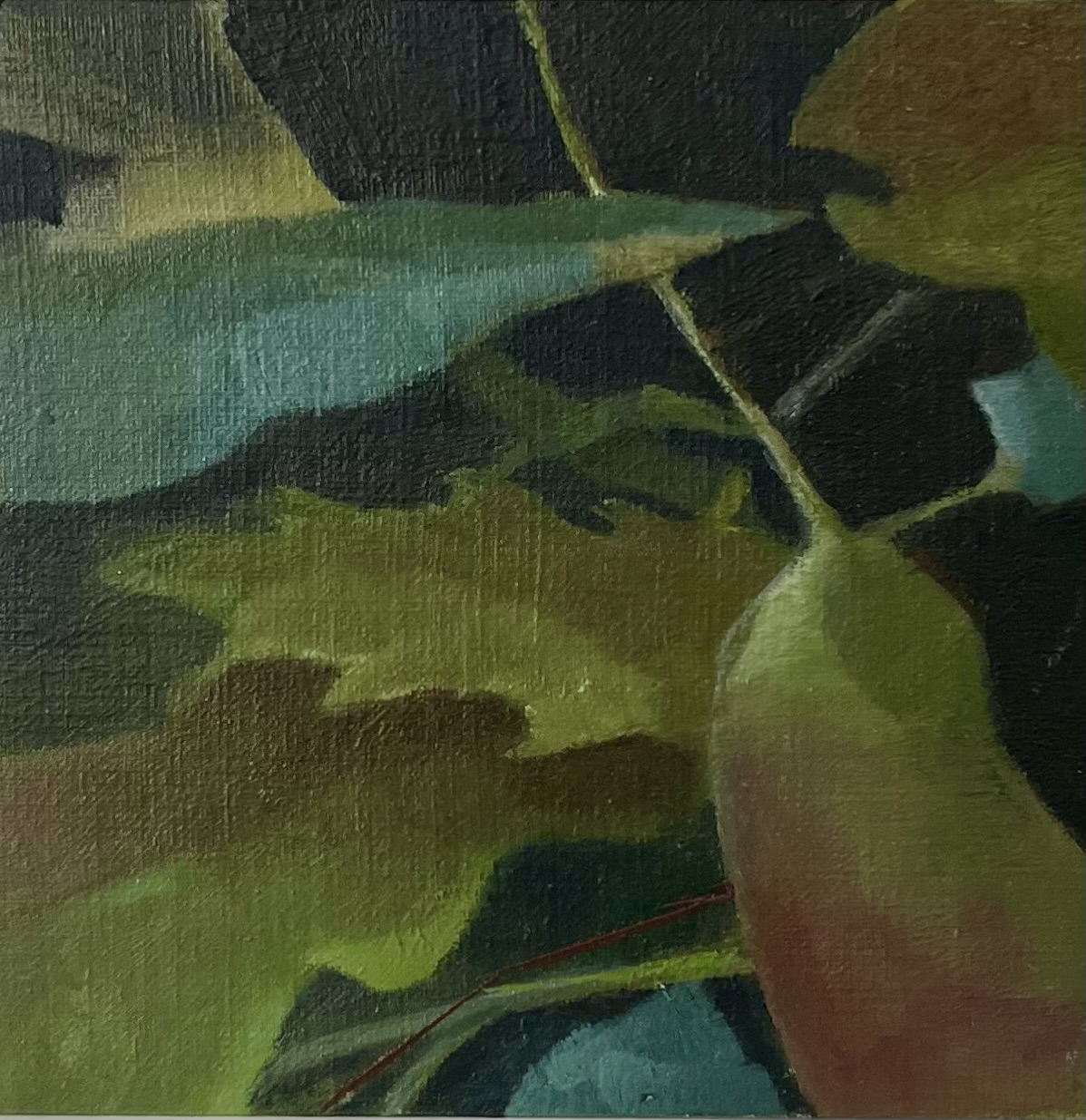 10×10 cm, geschilderd met olieverf op waterbasis, op linnenpapier geplakt op een stevig houten paneel, 3cm dik. Uitsparing aan de achterkant zodat het opgehangen kan worden. Kan ook neergezet.