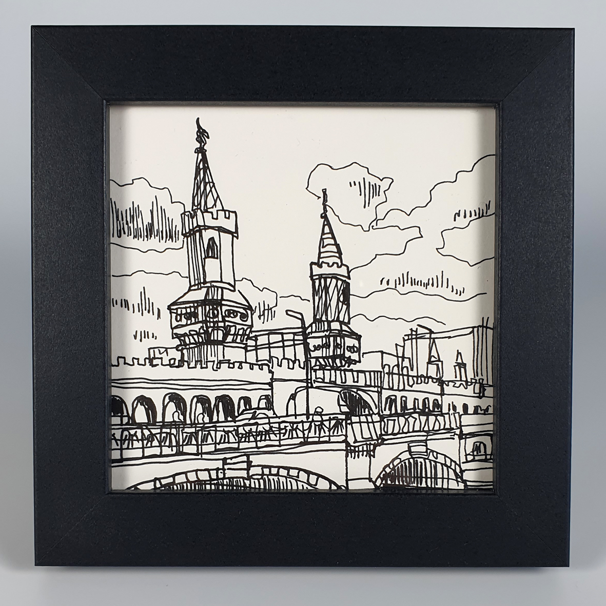 Gesigneerd op de achterzijde van het papier – ingelijst in 12 x 12 cm lijstje.