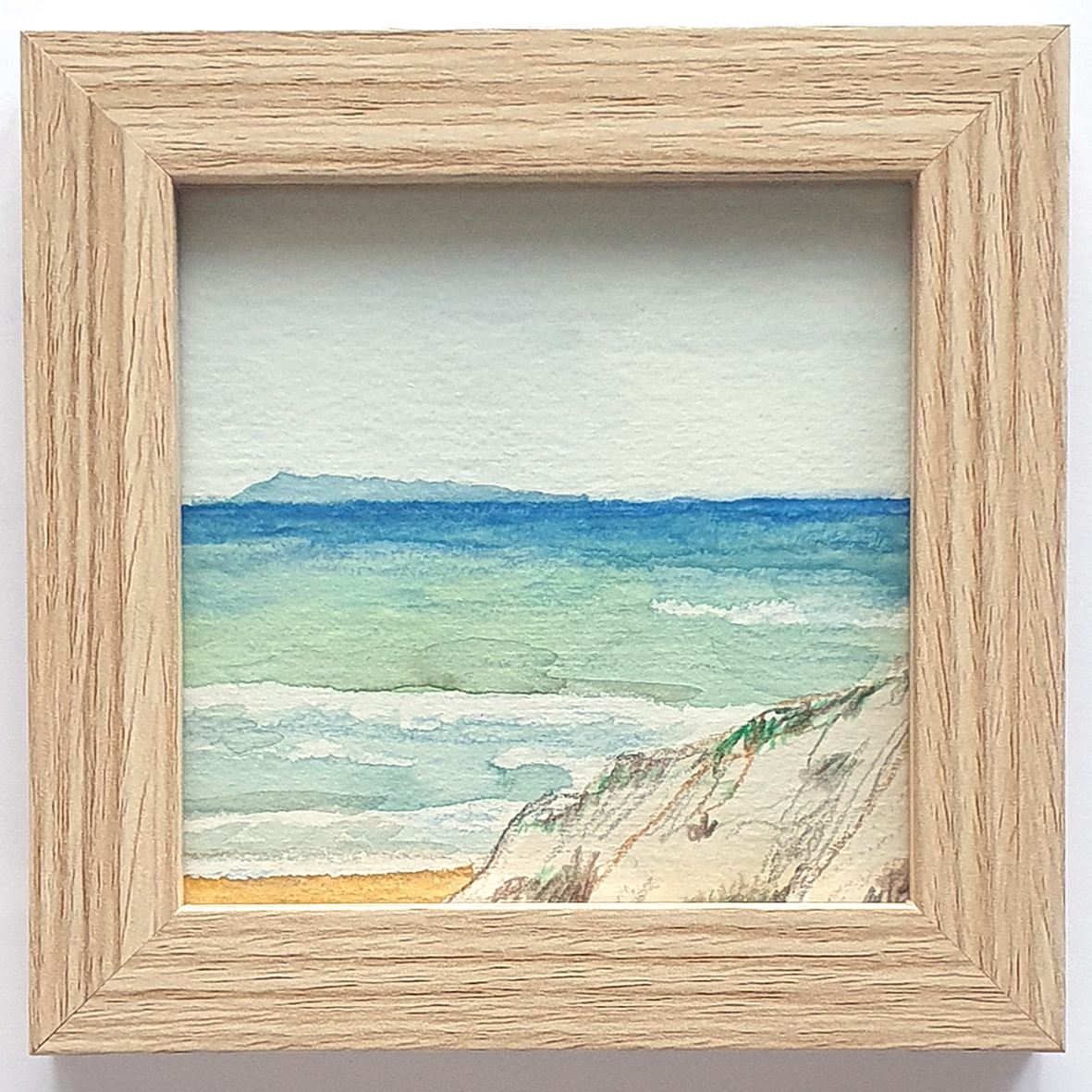 Gesigneerd op de achterzijde van het papier – ingelijst in 12 x 12 cm lijstje.