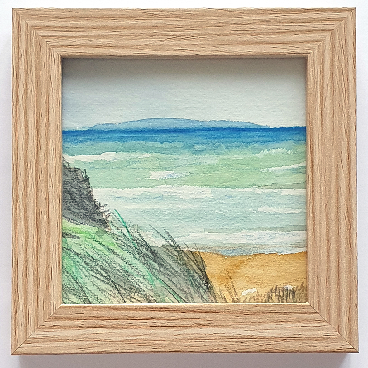 Gesigneerd op de achterzijde van het papier – ingelijst in 12 x 12 cm lijstje.